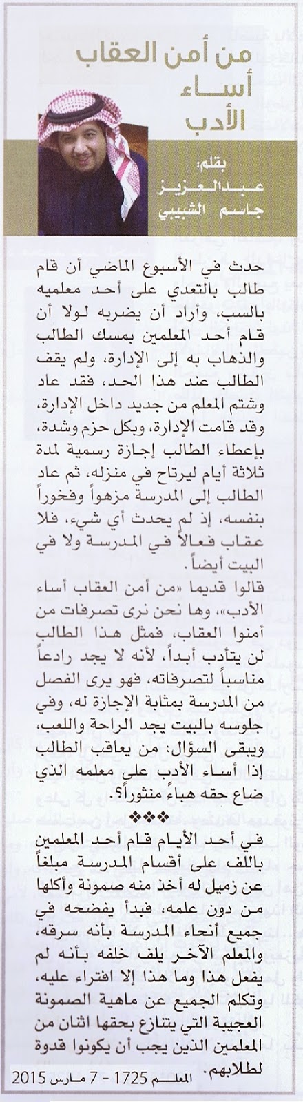 مدونة الكاتب الصحفي عبدالعزيز خريبط مقالة لزميل عبدالعزيز جاسم الشبيبي من آمن العقوبة أساء الأدب