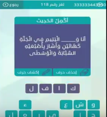 حل لغز انا و اليتيم فى الجنة كهاتين واشار باصبعيه السبابة والوسطى لغز رقم 118 من لعبة وصلة ف صقور الإبدآع