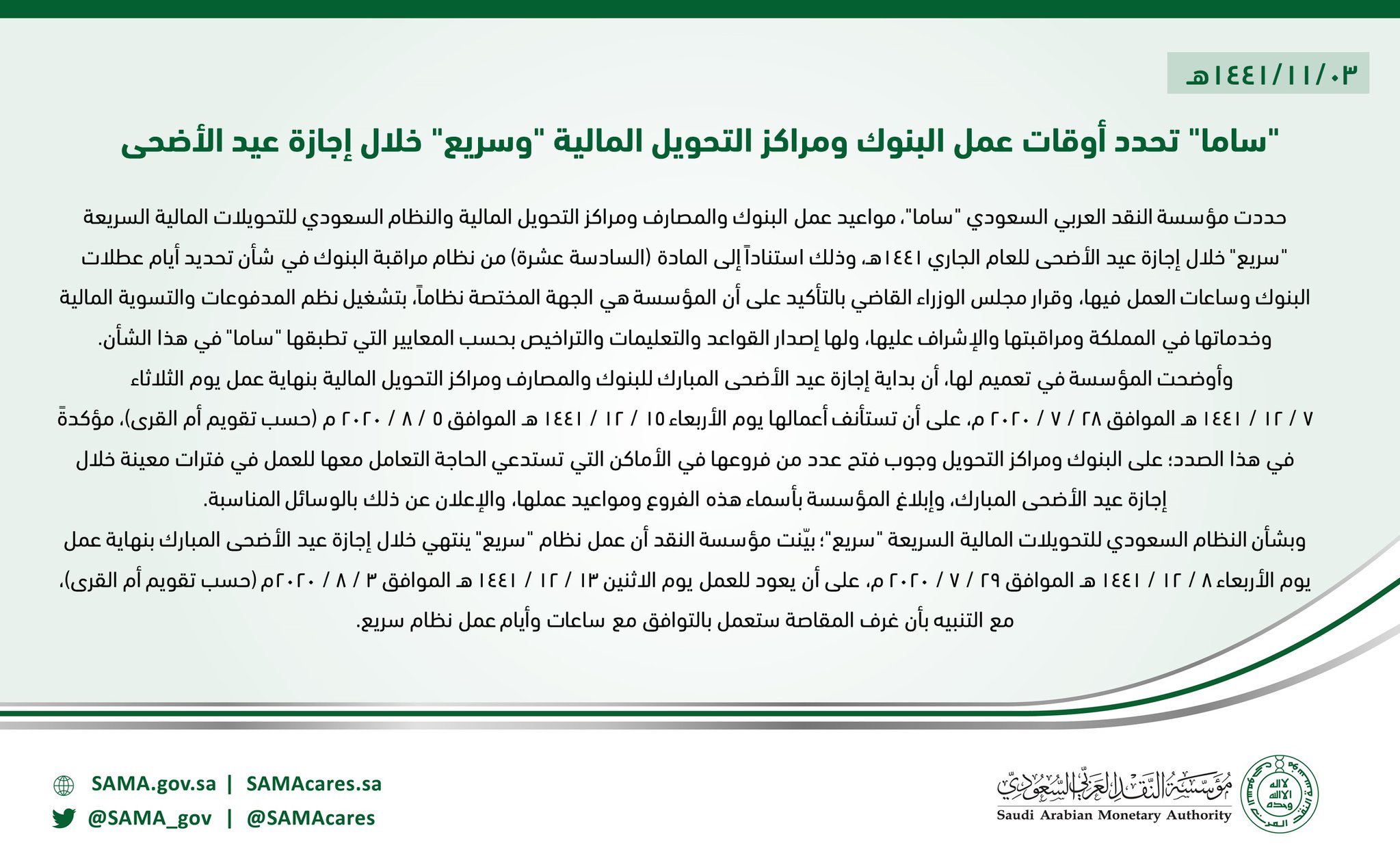 هاشتاق السعودية A Twitter ساما تحدد بداية إجازة عيد الأضحى للبنوك ومراكز التحويل بنهاية دوام الثلاثاء 1441 12 07 وي ستأنف العمل يوم الأربعاء 1441 12 15 Https T Co Fk89qlw4m5