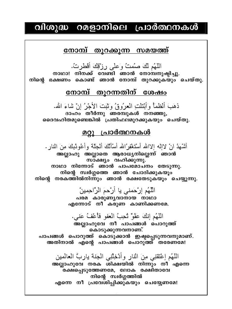 Ramdan Collected Duas In Malayalam