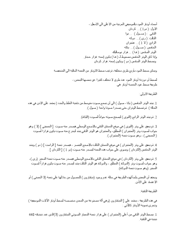 يعتبر العود من أكثر الآلات الشرقية شهرة وهو جزء أصيل من الموسيقا العربية ويمتاز باحتوائه على أوتار خمسة ومن الممكن أن يضاف إليه وتر سادس. اجـــزاء العــود تركيب الاوتار من المعروف أن عدد أوتار العود تكون خمسة أوتار وأحيانا ستة وهي أوتار مزدوجه تتفاوت في الغلظ والرقه متدرجه من أعلى صدر العود الاوتار غليظة الى الاسفل حيث الاوتار الرقيقة. بعد ما حكينا بالدرسين الماضيين عن بعض الرموز الموسيقيه و كيف نمسك آلة العود و كيف نحطها و نثبتها و كيف نمسك الريشه اليوم راح نتعرف على هدول التلات أوتار نيجي نتطلع مكتوب عندي أول وتر. 5 وتر الري على العود في الدرس الخامس نتعرف على وتر الري والنغمات الموجودة عليه و نتعلم أيضا تمارين للعزف على وتر الري.